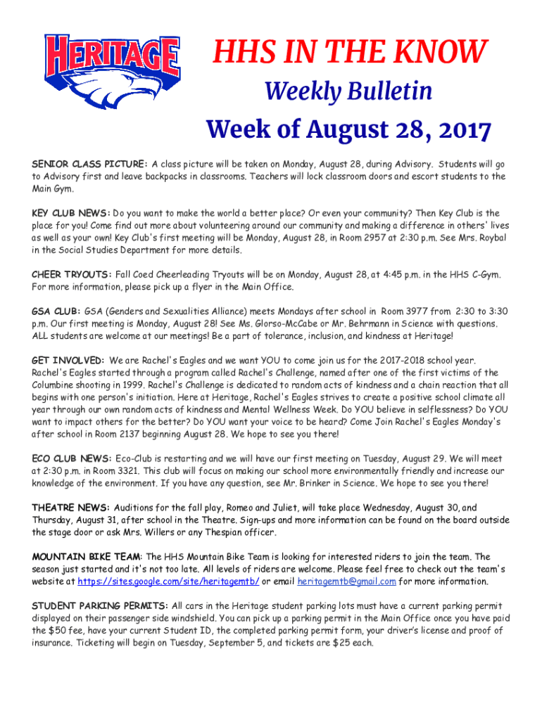 HHS IN THE KNOW Weekly Bulletin Week Of August 28, 2017, SENIOR CLASS PICTURE: A class picture will be taken on Monday, August 28, during Advisory. Students will go to Advisory first and leave backpacks