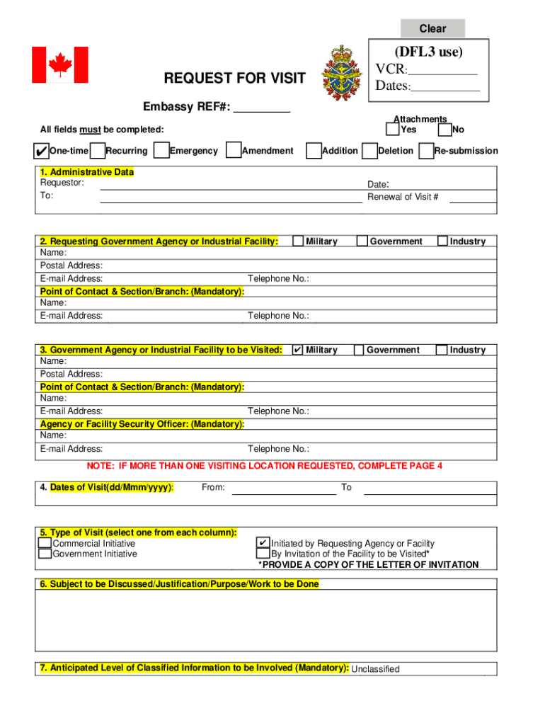 Clear(DFL3 use) VCR:___ Dates:___REQUEST FOR VISIT Embassy REF#:Attachments Yes All fields must be completed: OnetimeRecurringEmergencyAmendmentAddition1. Administrative Data Requestor: To:DeletionResubmissionDate: