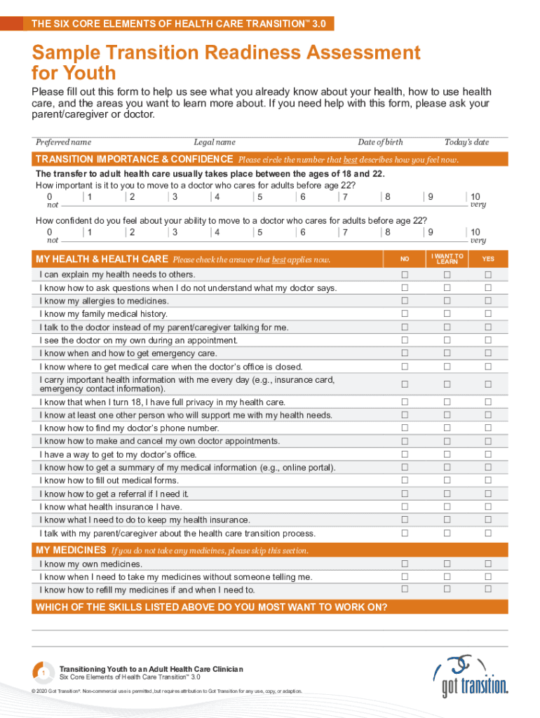THE SIX CORE ELEMENTS OF HEALTH CARE TRANSITION 3.0Sample Transition Readiness Assessment for YouthPlease fill out this form to help us see what you already know about your health, how to use health