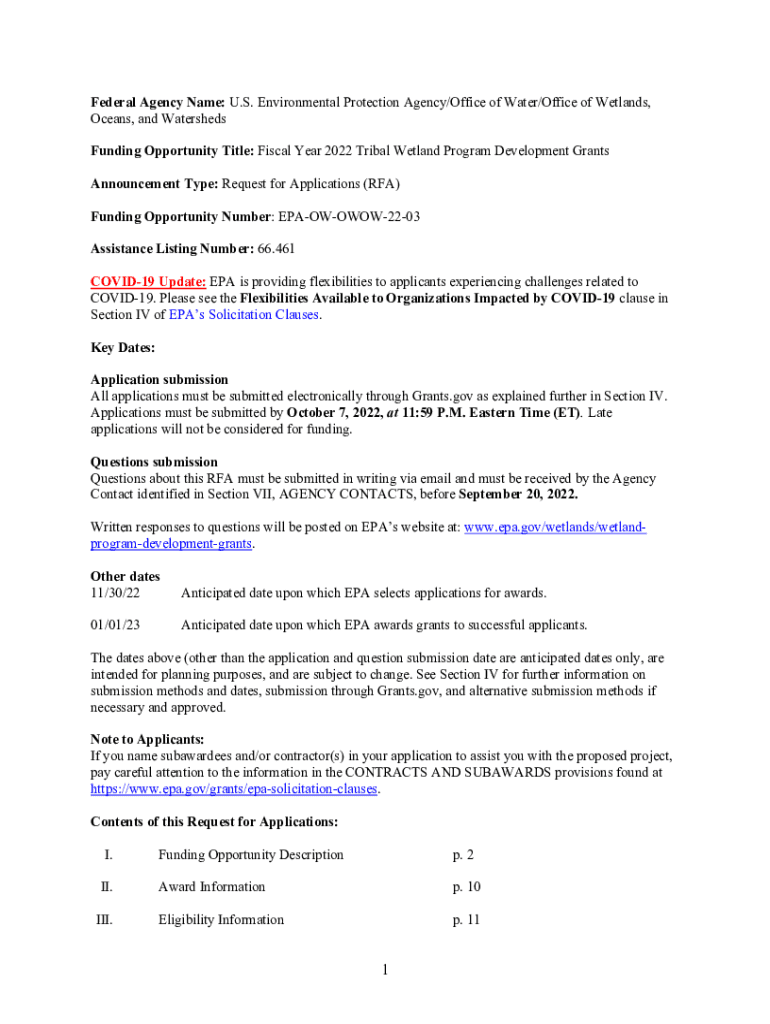 Federal Agency Name: U.S. Environmental Protection Agency/Office of Water/Office of Wetlands, Oceans, and Watersheds Funding Opportunity Title: Fiscal Year 2022 Tribal Wetland Program Development