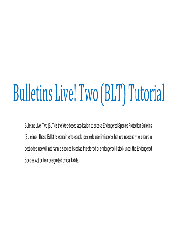 Bulletins Live! Two (BLT) Tutorial Bulletins Live! Two (BLT) is the Web based application to access Endangered Species Protection Bulletins (Bulletins). These Bulletins contain enforceable pesticide