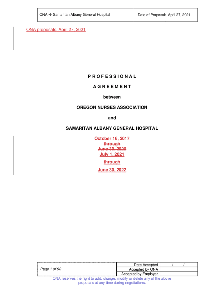ON Samaritan Albany General Hospitality of Proposal: April 27, 2021ONA proposals, April 27, 2021PROFESSIONAL AGREEMENT between OREGON NURSES ASSOCIATION and SAMARITAN ALBANY GENERAL HOSPITAL October
