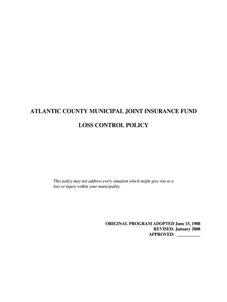 ATLANTIC COUNTY MUNICIPAL JOINT INSURANCE FUND LOSS CONTROL POLICY This policy may not address every situation which might give rise to a loss or injury within your municipality. ORIGINAL PROGRAM