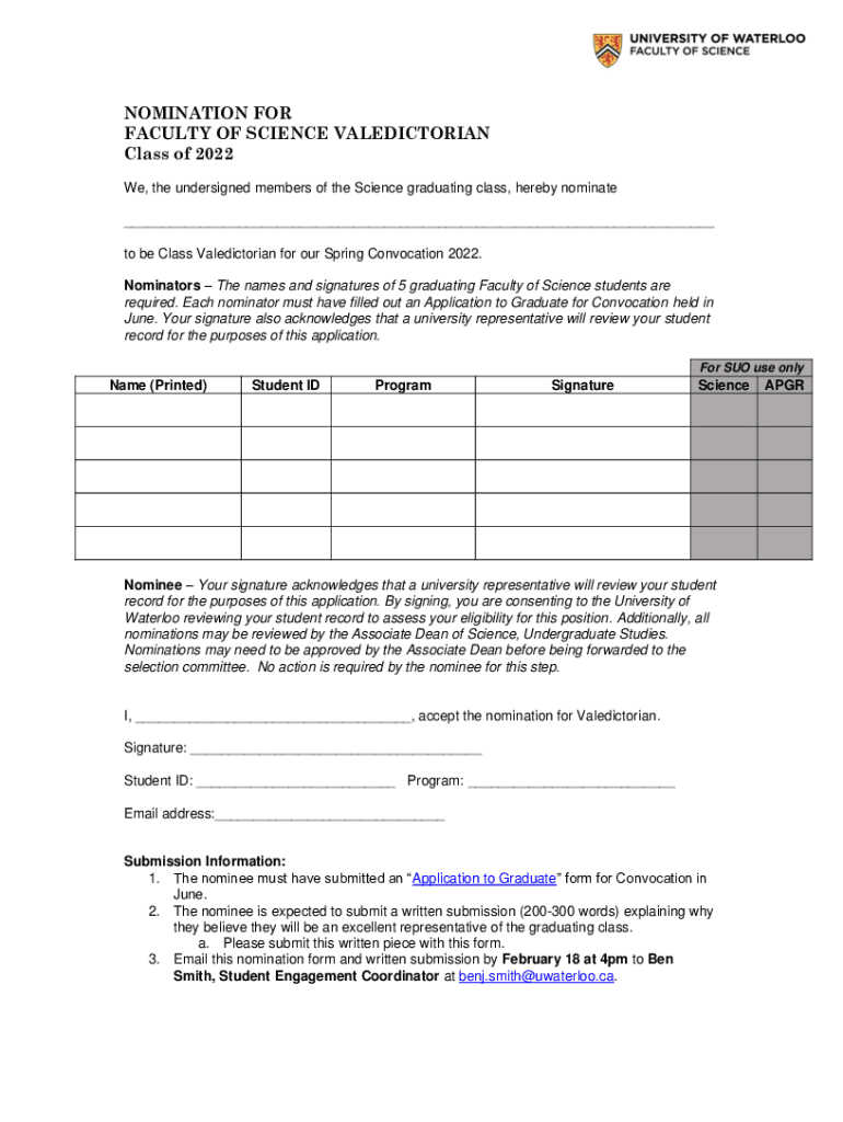 Get the free NOMINATION FOR FACULTY OF SCIENCE VALEDICTORIAN ...