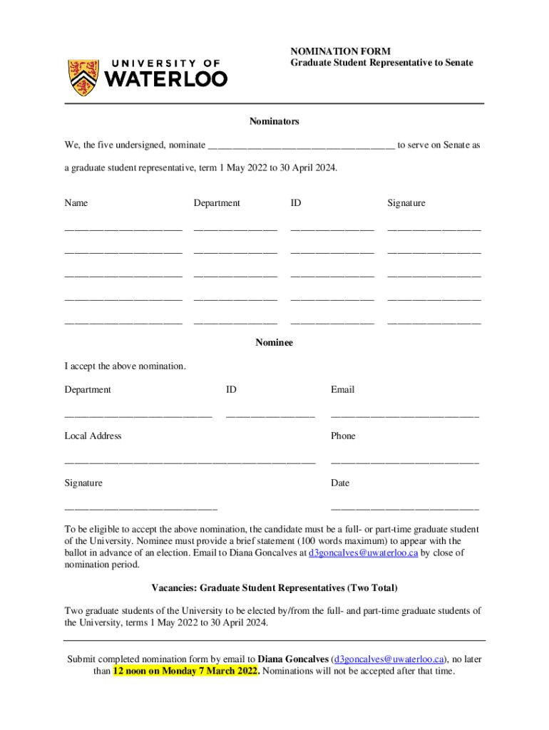 NOMINATION FORM Graduate Student Representative to SenateNominators We, the five undersigned, nominate ___ to serve on Senate as a graduate student representative, term 1 May 2022 to 30 April 2024.NameDepartmentIDSignature____________________________________________________________Nominee