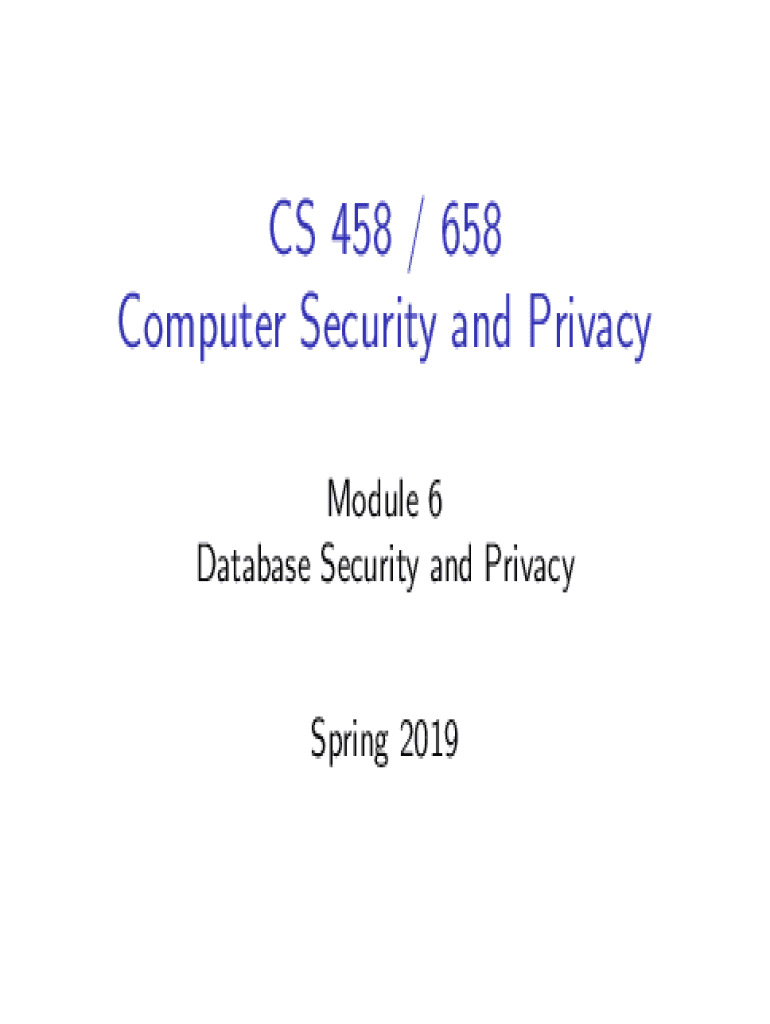 CS 458 / 658 Computer Security and Privacy Module 6 Database Security and Privacy Spring 2019Module outline 1 Introduction to databases 2 Security requirements 3 Data disclosure and inference 4 Multilevel