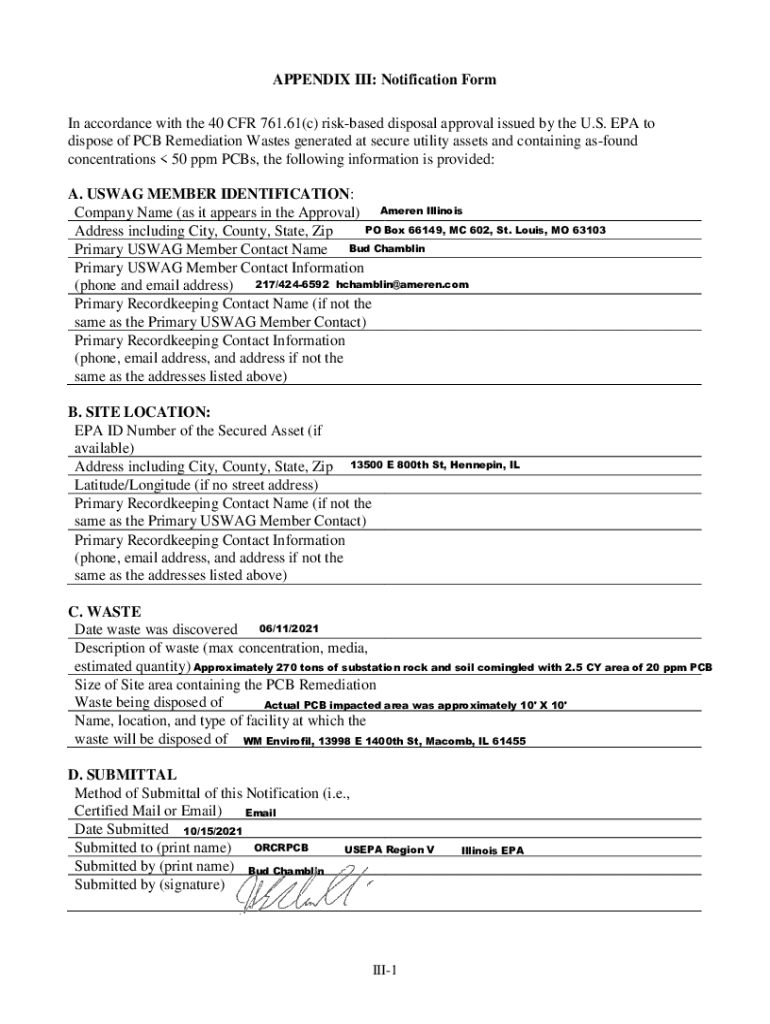 APPENDIX III: Notification Form In accordance with the 40 CFR 761.61(c) risk based disposal approval issued by the U.S. EPA to dispose of PCB Remediation Wastes generated at secure utility assets