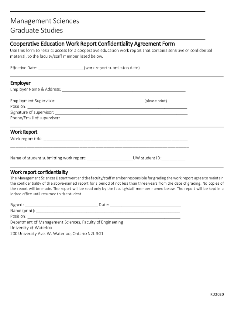 Management Sciences Graduate Studies Cooperative Education Work Report Confidentiality Agreement Form Uses this form to restrict access for a cooperative education work report that contains sensitive