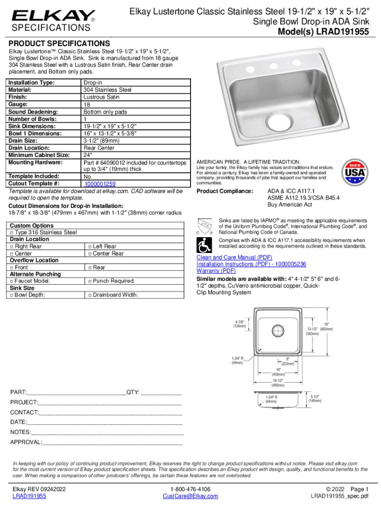 SPECIFICATIONSElkay Luster tone Classic Stainless Steel 191/2\” x 19\” x 51/2\” Single Bowl Drop in ADA Sink Model(s) LRAD191955PRODUCT SPECIFICATIONS Elway Luster tone Classic Stainless Steel
