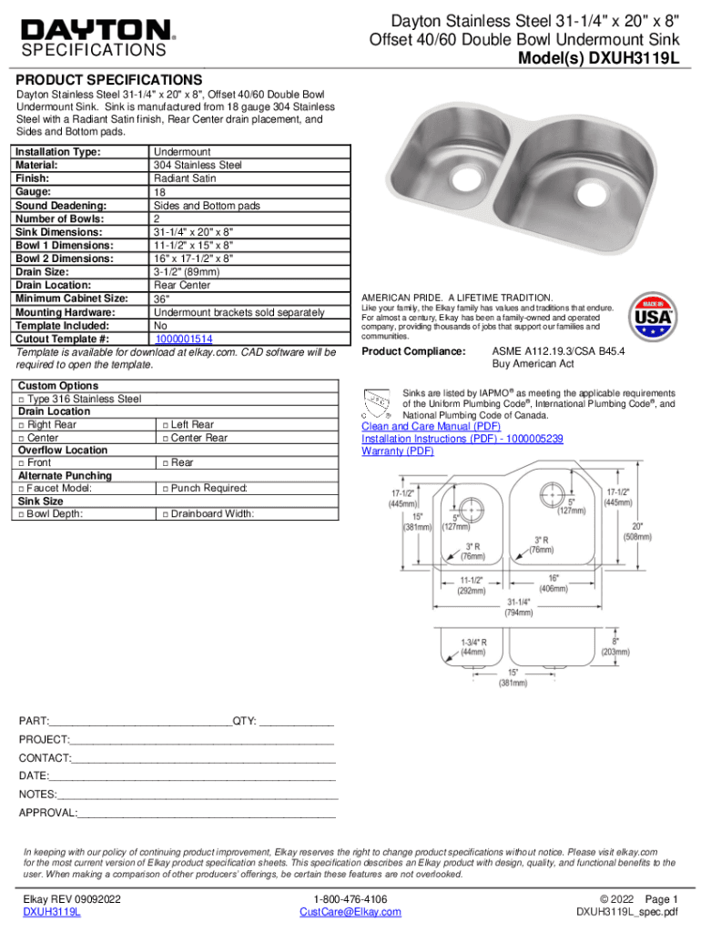 Dayton Stainless Steel 311/4\” x 20\” x 8\” Offset 40/60 Double Bowl Under mount Sink Model(s) DXUH3119LSPECIFICATIONS PRODUCT SPECIFICATIONS Dayton Stainless Steel 311/4\” x 20\” x 8\”,