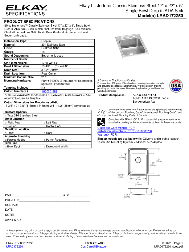 SPECIFICATIONSElkay Luster tone Classic Stainless Steel 17\” x 22\” x 5\” Single Bowl Drop in ADA Sink Model(s) LRAD172250PRODUCT SPECIFICATIONS Elway Luster tone Classic Stainless Steel 17\”