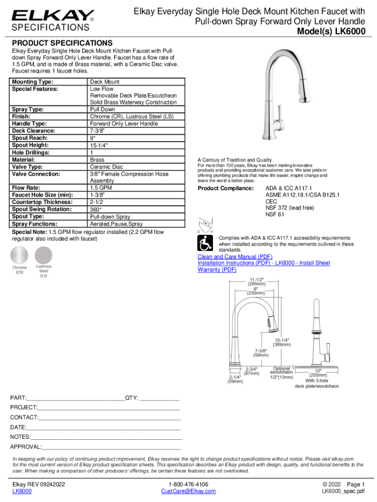 SPECIFICATIONSElkay Everyday Single Hole Deck Mount Kitchen Faucet with Pull down Spray Forward Only Lever Handle Model(s) LK6000PRODUCT SPECIFICATIONS Elway Everyday Single Hole Deck Mount Kitchen