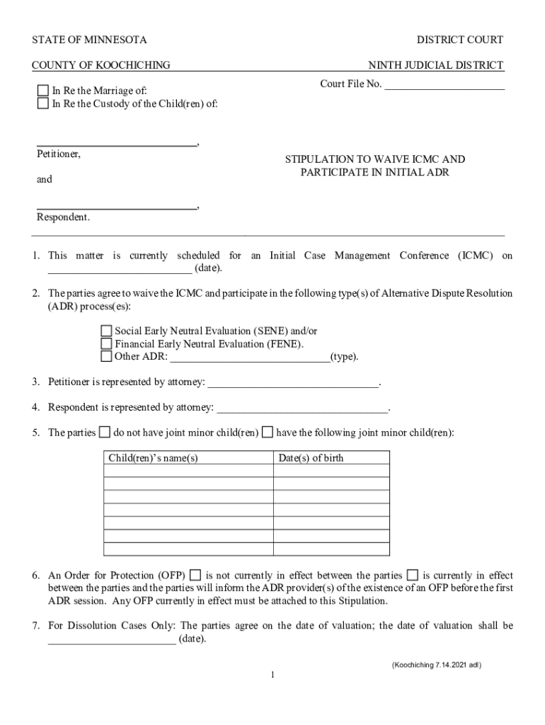 STATE OF MINNESOTADISTRICT COURTEOUSLY OF KOOCHICHINGNINTH JUDICIAL DISTRICT Court File No. ___In Re the Marriage of: In Re the Custody of the Child(men) of:Petitioner, STIPULATION TO WAIVE ICM AND