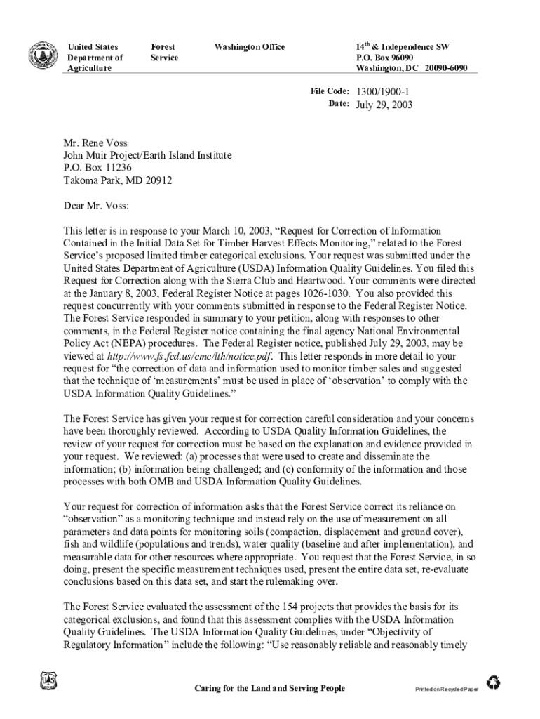 United States Department of Agriculture Forest Service14th & Independence SW P.O. Box 96090 Washington, DC 200906090Washington OfficeFile Code: 1300/19001 Date: July 29, 2003Mr. Rene Loss John Muir