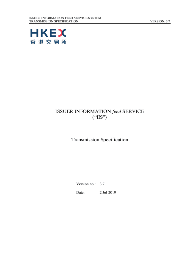 ISSUER INFORMATION FEED SERVICE SYSTEM TRANSMISSION SPECIFICATIONISSUER INFORMATION feed SERVICE (IIS)Transmission SpecificationVersion no.:3.7Date:2 Jul 2019VERSION: 3.7ISSUER INFORMATION FEED SERVICE
