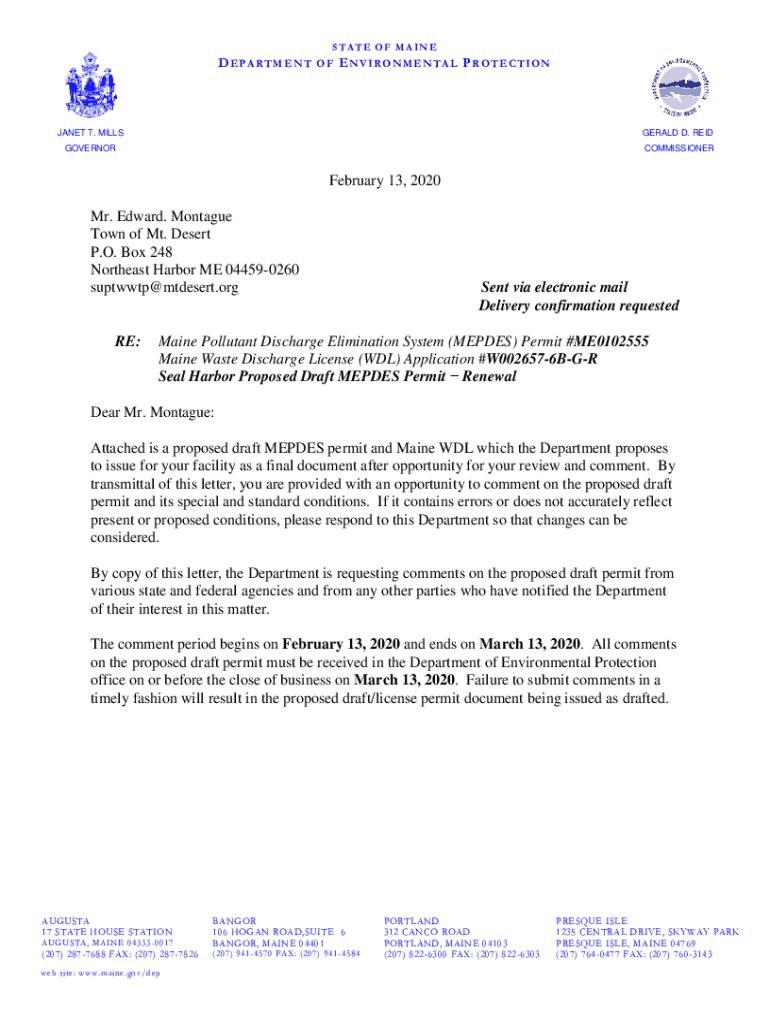 STATE OF MAINEDEPARTMENT OF ENVIRONMENTAL PROTECTIONJANET T. MILLSGERALD D. REIDGOVERNORCOMMISSIONERFebruary 13, 2020