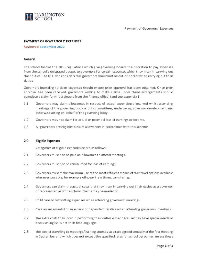 Payment of Governors ExpensesPAYMENT OF GOVERNORS EXPENSES Reviewed: September 2022General The school follows the 2013 regulations which give governing boards the discretion to pay expenses from the