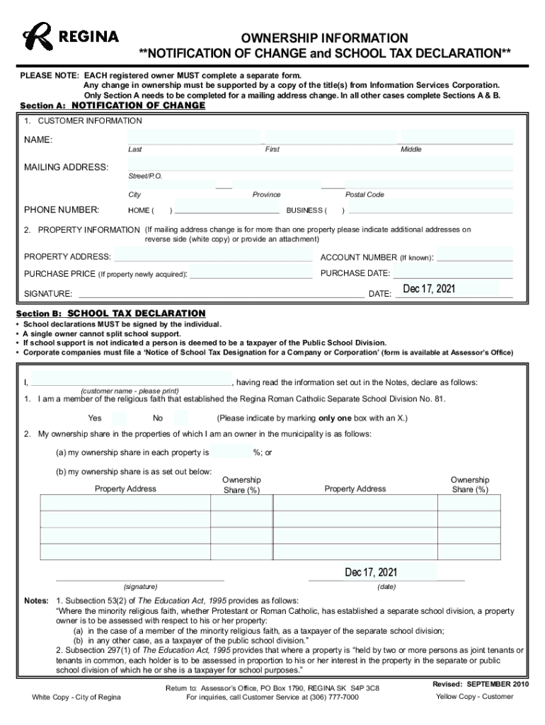 OWNERSHIP INFORMATION **NOTIFICATION OF CHANGE and SCHOOL TAX DECLARATION**PLEASE NOTE: EACH registered owner MUST complete a separate form. Any change in ownership must be supported by a copy of