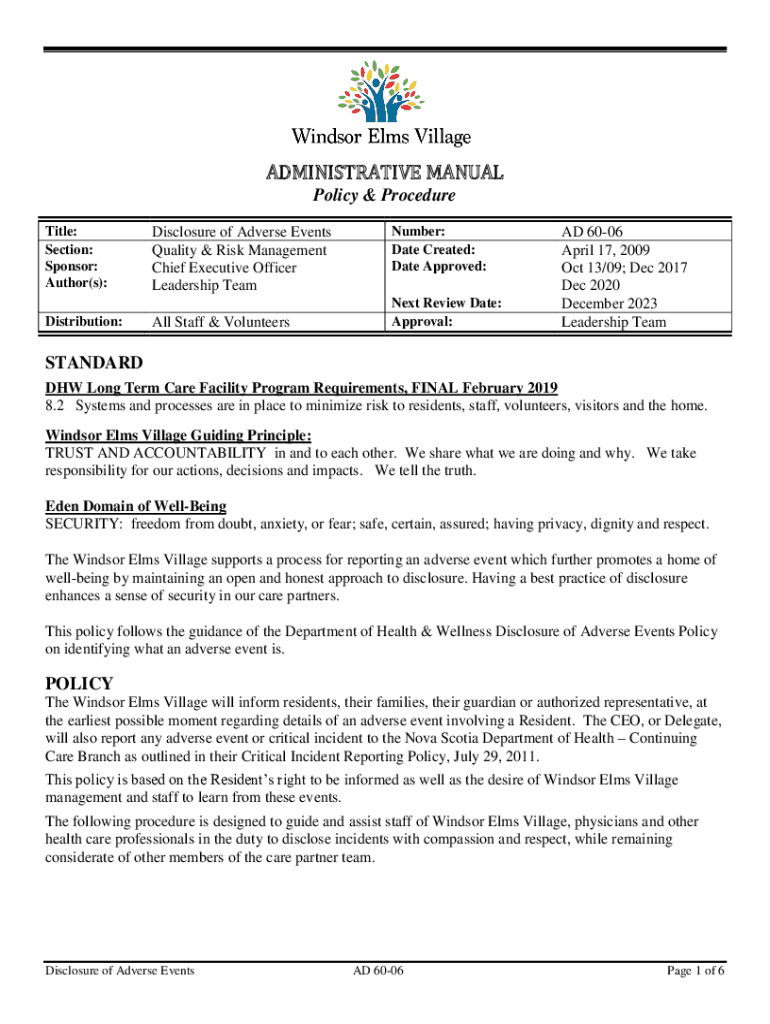 ADMINISTRATIVE MANUAL Policy & Procedure Title: Section: Sponsor: Author(s): Distribution:Disclosure of Adverse Events Quality & Risk Management Chief Executive Officer Leadership Team All Staff &