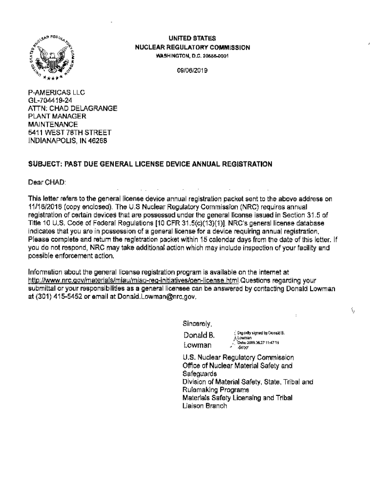 UNITED STATES NUCLEAR REGULATORY COMMISSION WASHINGTON, D.C. 20566.()00109/06/2019PAMERICAS LLC GL70441924 LATIN: CHAD LAGRANGE PLANT MANAGER MAINTENANCE 5411 WEST 78TH STREET INDIANAPOLIS, IN 46268SUBJECT: