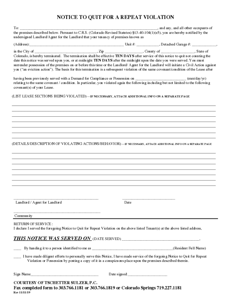 Get the free NOTICE TO QUIT FOR A REPEAT VIOLATION-CDC - Tschetter Sulzer: Denver ...