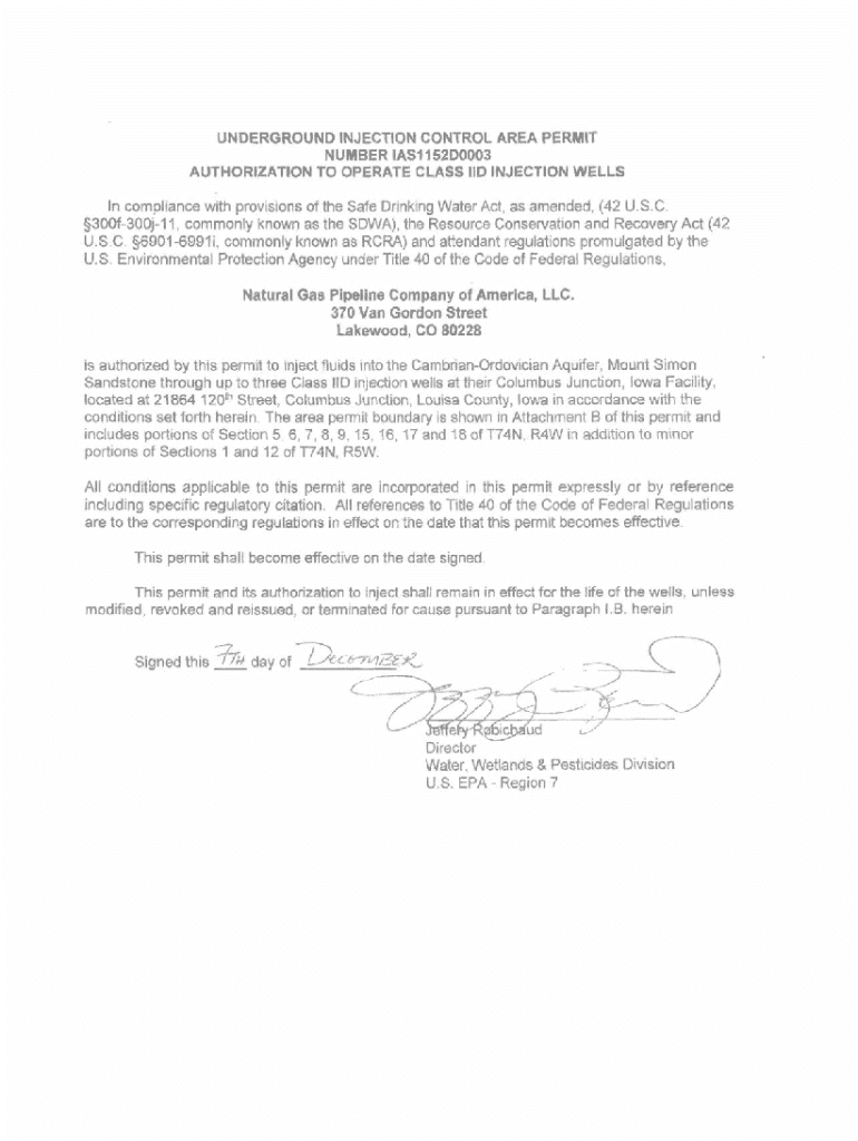 UNDERGROUND INJECTION CONTROL AREA PERMIT NUMBER IAS1152D0003 AUTHORIZATION TO OPERATE CLASS 110 INJECTION WELLS In compliance with provisions of the Safe Drinking Water Act, as amended, (42 U.S.C.