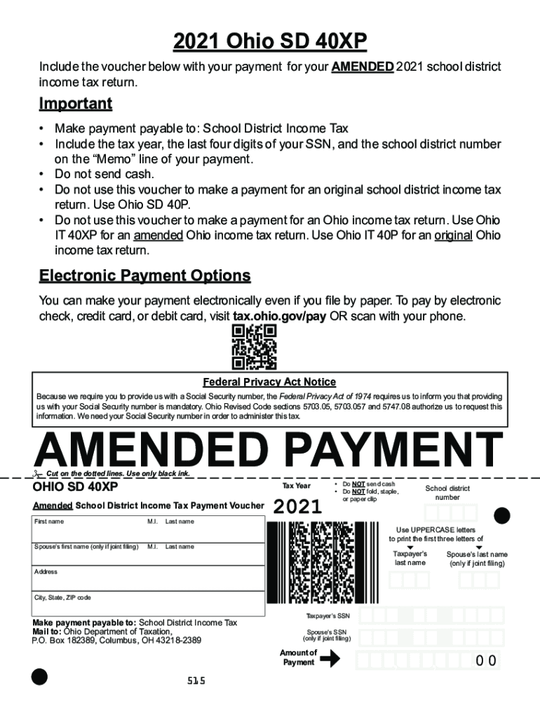 2021 Ohio SD 40XP Include the voucher below with your payment for your AMENDED 2021 school district income tax return. Important Make payment payable to: School District Income Tax Include the tax