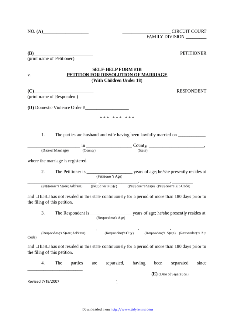 NO. (A)______ CIRCUIT COURT FAMILY DIVISION ___(B)___ (print name of Petitioner)PETITIONERSELFHELP FORM #1B PETITION FOR DISSOLUTION OF MARRIAGE (With Children Under 18)v.(C)___ (print name of Respondent)RESPONDENT(D)