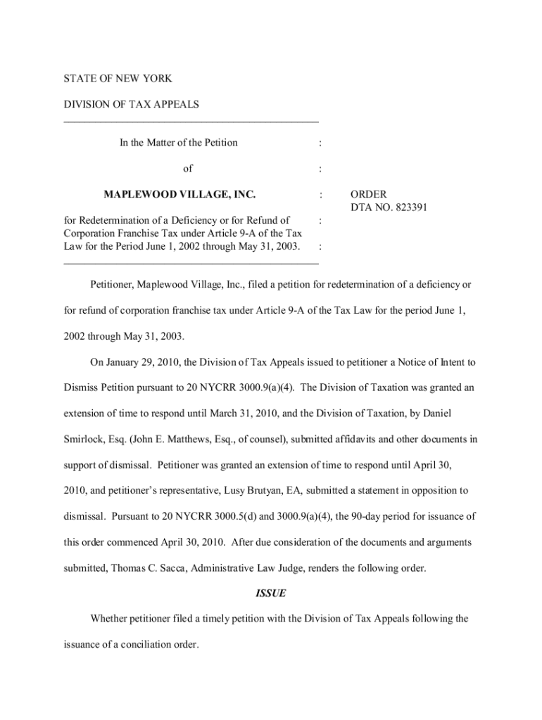 STATE OF NEW YORK DIVISION OF TAX APPEALS ___ In the Matter of the Petition:of:APPLEWOOD VILLAGE, INC.:ORDER DTA NO. 823391for Redetermination of a Deficiency or for Refund of : Corporation Franchise