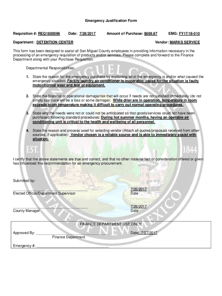 Emergency Justification FormRequisition #: REQ1800096Date: 7/28/2017Amount of Purchase: $669.87Department: DETENTION CENTERED: FY17/18010Vendor: MARKS Services form has been designed to assist all