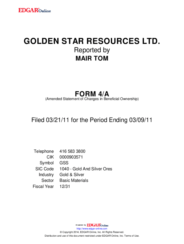 GOLDEN STAR RESOURCES LTD. Reported by AIR COMFORT 4/A(Amended Statement of Changes in Beneficial Ownership)Filed 03/21/11 for the Period Ending 03/09/11Telephone CIK Symbol SIC Code Industry Sector