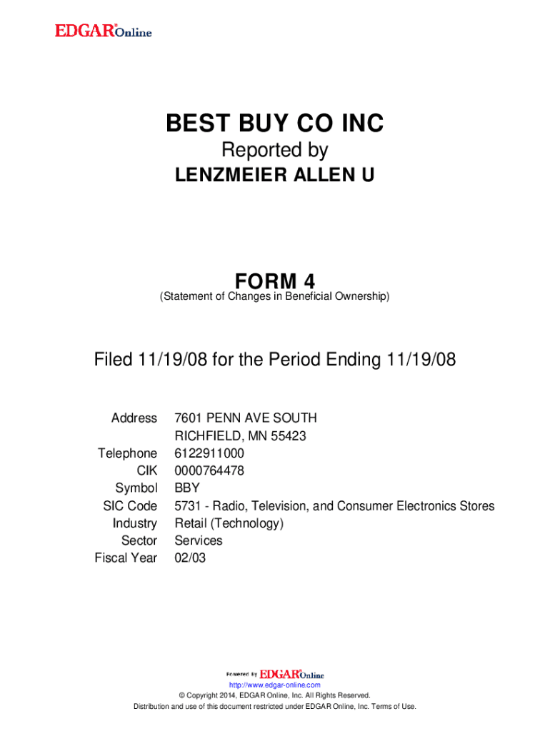 Get the free BEST BUY CO INC. FORM 4 (Statement of Changes in Beneficial Ownership) Filed 11/19/0...
