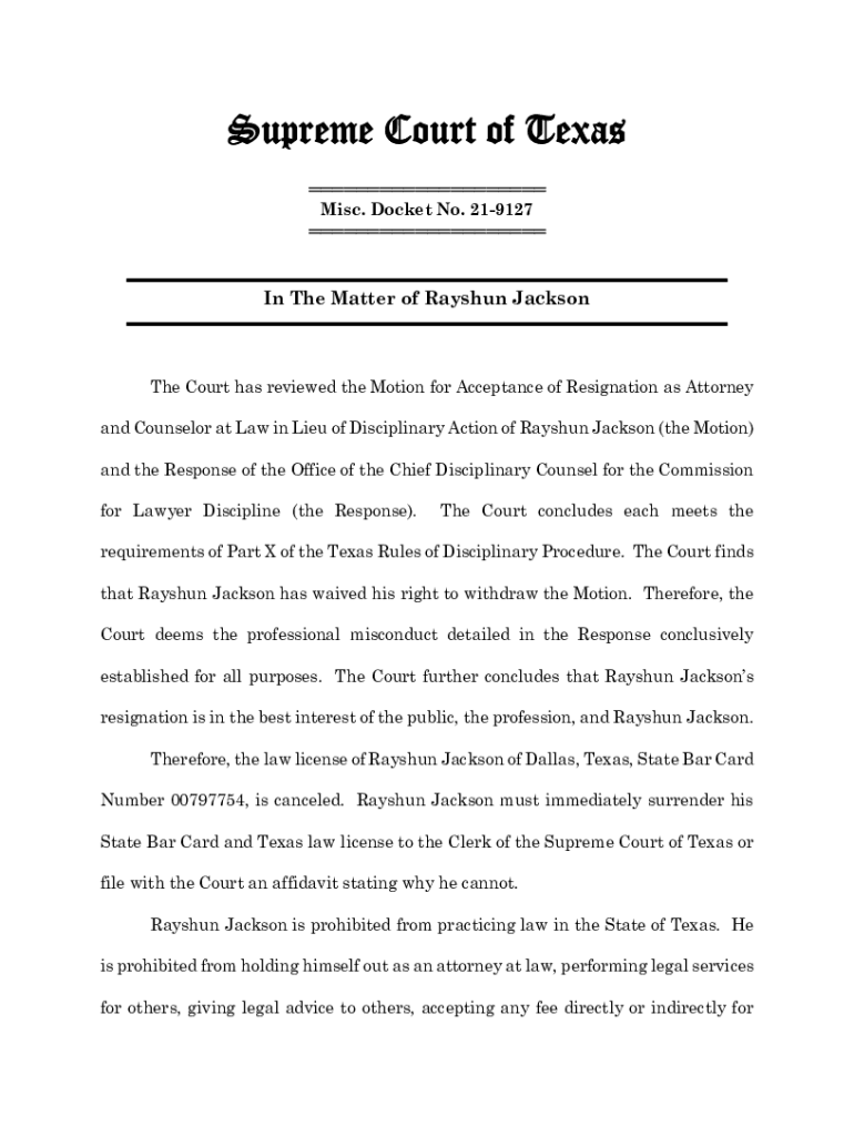 Supreme Court of Texas Misc. Docket No. 219127 In The Matter of Ration Jackson Court has reviewed the Motion for Acceptance of Resignation as Attorney and Counselor at Law in Lieu of Disciplinary