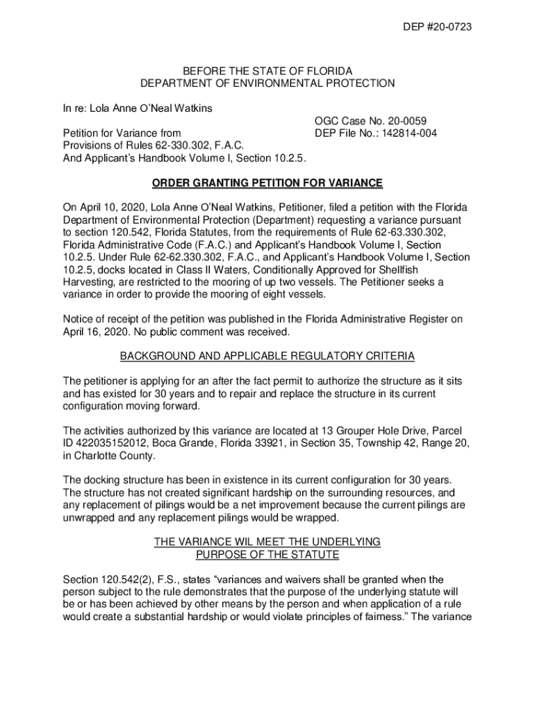 DEP #200723BEFORE THE STATE OF FLORIDA DEPARTMENT OF ENVIRONMENTAL PROTECTION In re: Lola Anne Oneal Watkins Petition for Variance from Provisions of Rules 62330.302, F.A.C. And Applicants Handbook