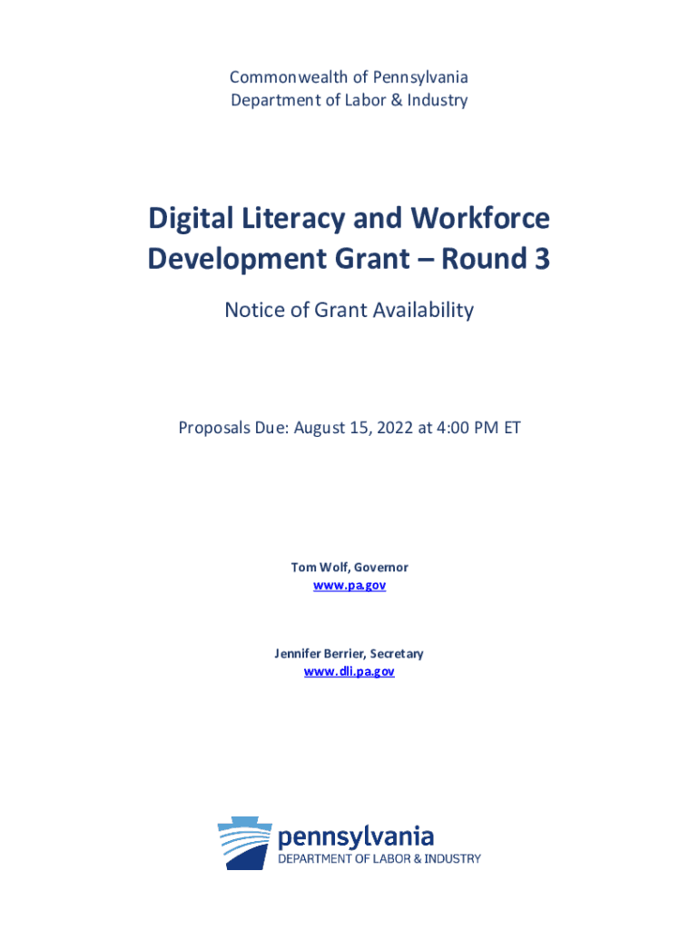 Commonwealth of Pennsylvania Department of Labor & IndustryDigital Literacy and Workforce Development Grant Round 3 Notice of Grant AvailabilityProposals Due: August 15, 2022, at 4:00 PM ET Tom Wolf,