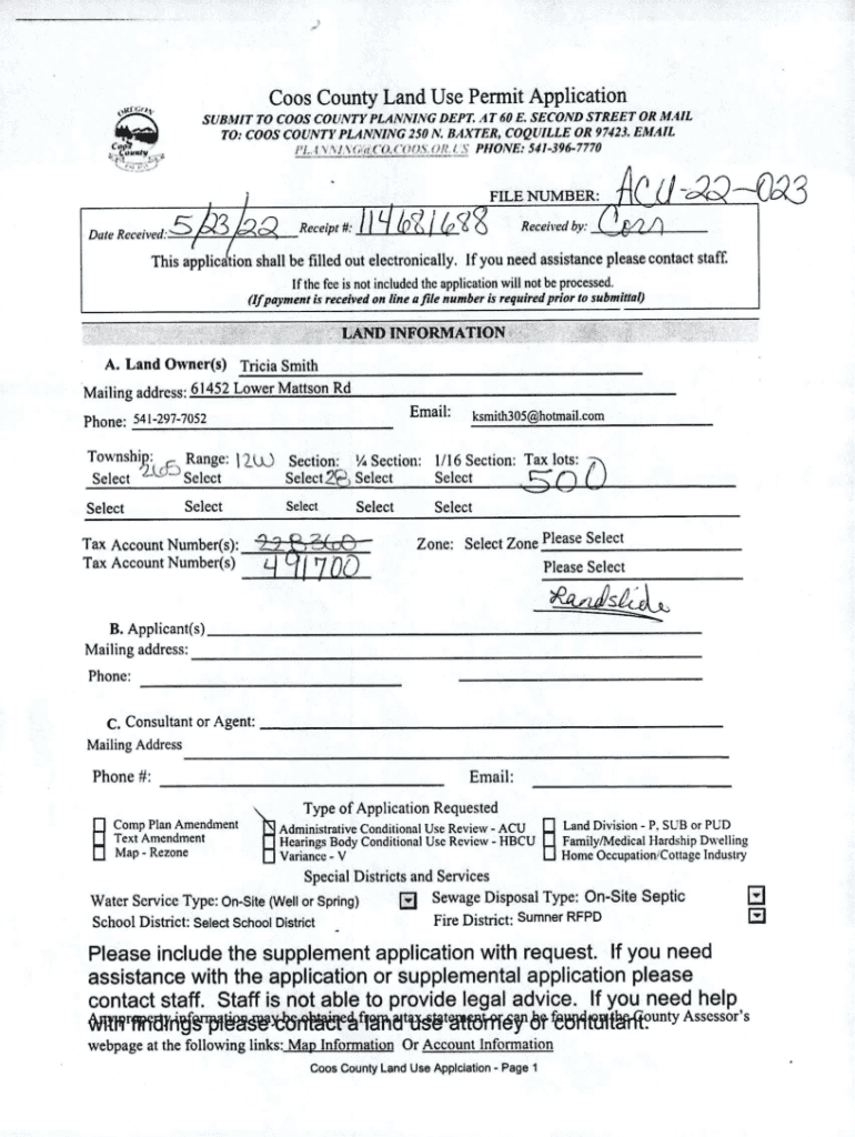 Coos County Land Use Permit Application Cos\'1×SUBMIT TO COOS COUNTY PLANNING DEPT. A T 60 E. SECOND STREET OR MAIL TO: COOS COUNTY PLANNING 2S0 N. BAXTER, COLVILLE OR 97423. EMAIL IL t N l in CO.