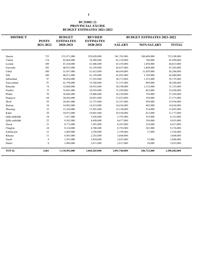 1 BC21002 (2) PROVINCIAL EXCISE BUDGET ESTIMATES 20212022___ DISTRICT POSTS 20212022BUDGET ESTIMATES 20202021REVISED ESTIMATES 20202021BUDGET ESTIMATES 20212022 ___ SALARY TOTAL___ Quetta Turban Coralie