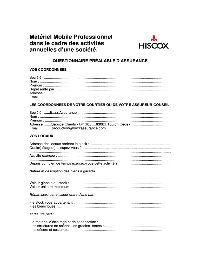 Mat rail Mobile Professional days LE cadre DES activity s annulled dune sci t. QUESTIONNAIRE PR ARABLE D ASSURANCE LOS CORDON ES Sci t : ............................................................................................................................