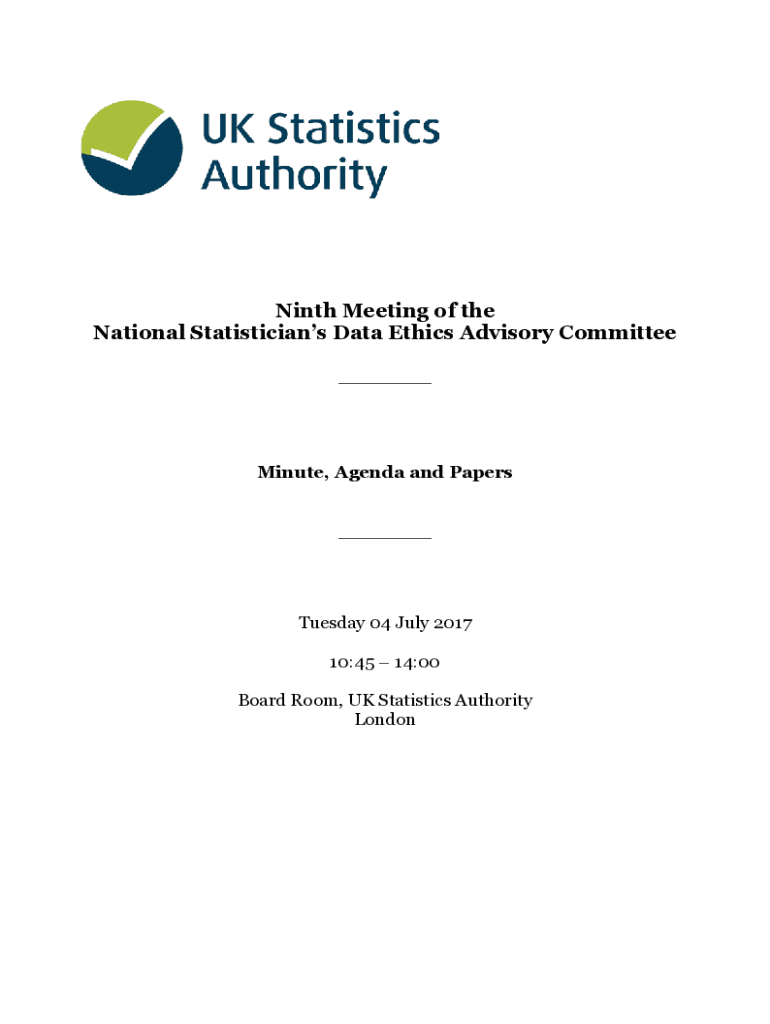 Ninth Meeting of the National Statisticians Data Ethics Advisory Committee ___Minute, Agenda and Papers ___Tuesday 04 July 2017 10:45 14:00 Board Room, UK Statistics Authority London UK STATISTICS