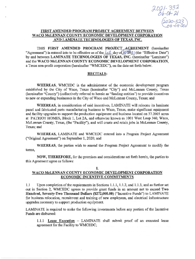 FIRST AMENDED PROGRAM PROJECT AGREEMENT BETWEEN WACO McLennan County ECONOMIC DEVELOPMENT CORPORATION AND LAMINATE TECHNOLOGIES OF TEXAS. INC.THIS FIRST AMENDED PROGRAM PROJECT AGREEMENT (hereinafter