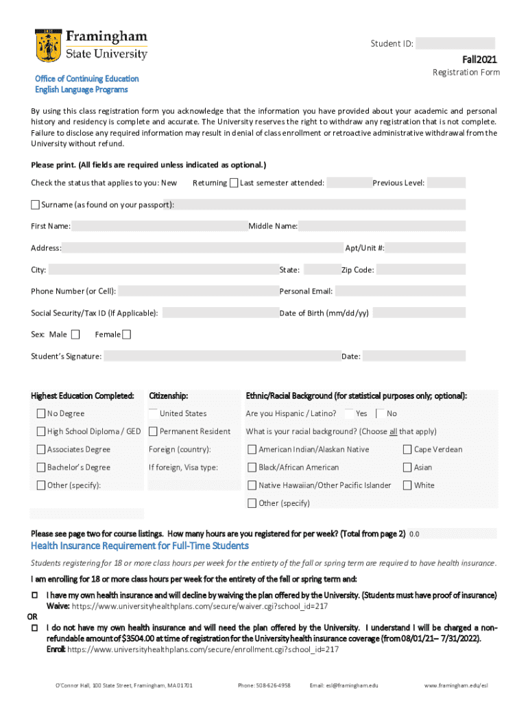 Student ID:Fall2021 Registration FormOffice of Continuing Education English Language Programs using this class registration form you acknowledge that the information you have provided about your academic