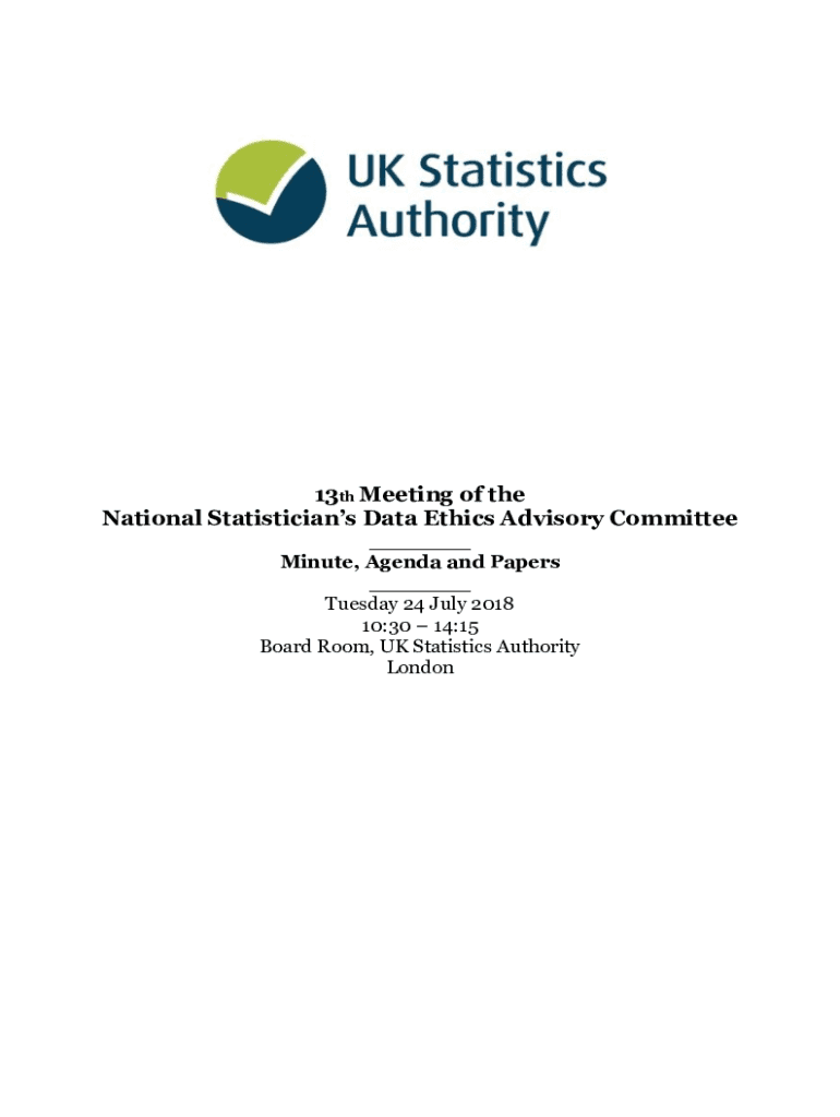 13th Meeting of the National Statisticians Data Ethics Advisory Committee ___ Minute, Agenda and Papers ___ Tuesday 24 July 2018 10:30 14:15 Board Room, UK Statistics Authority London UK STATISTICS