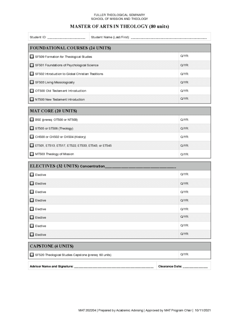 Get the free Full Time MAT Curriculum Sheet - Fuller Theological Seminary