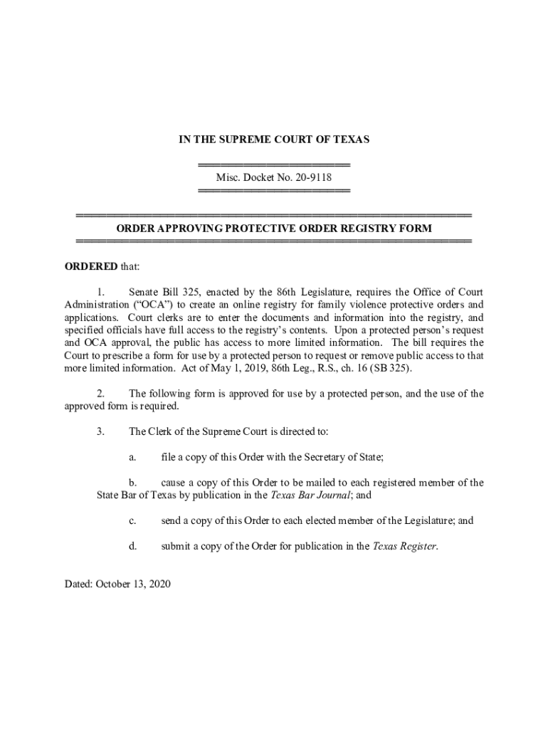 IN THE SUPREME COURT OF TEXAS Misc. Docket No. 209118 ORDER APPROVING PROTECTIVE ORDER REGISTRY FORM ORDERED.