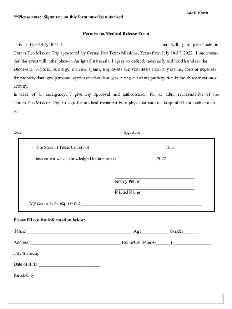 Adult Form **Please note: Signature on this form must be notarizedPermission/Medical Release Form This is to certify that I ___ am I willing to participate in Coral Do Mission Trip sponsored by Coral