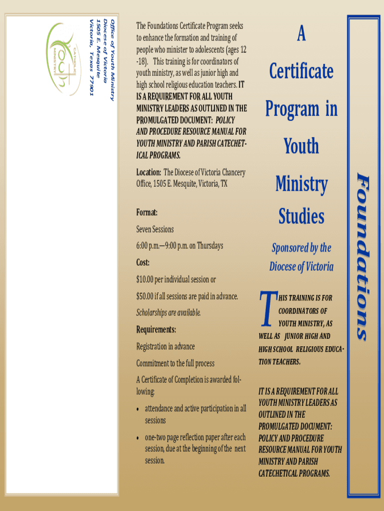 Office of Youth Ministry Diocese of Victoria 1505 E. Mesquite Victoria, Texas 77901The Foundations Certificate Program seeks to enhance the formation and training of people who minister to adolescents