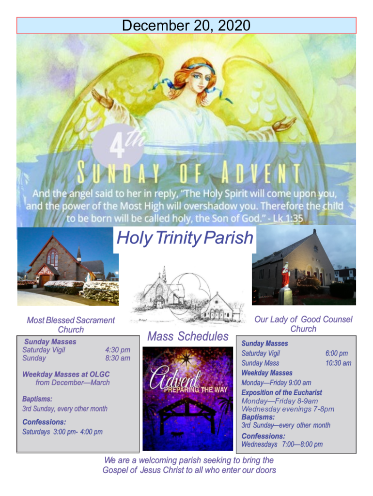 December 20, 2020MondayFriday 89am Wednesday evenings 78pmEmail: holytrinityquincyma@gmail.comChristmas Mass Schedule By Reservation Christmas Eve 3 pm & 4:30 pm at MBS 6 pm at OLGCChristmas Day 8:30