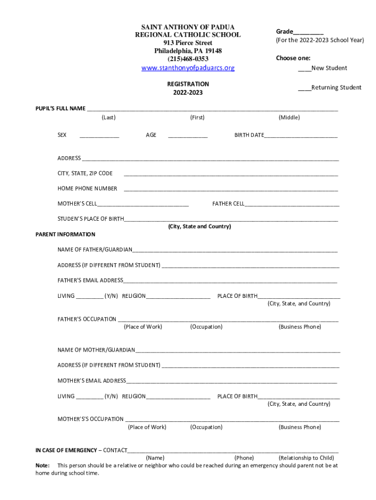 SAINT ANTHONY OF PADUA REGIONAL CATHOLIC SCHOOL 913 Pierce Street Philadelphia, PA 19148 (215)4680353www.stanthonyofpaduarcs.org REGISTRATION 20222023Grade___ (For the 20222023 School Year) Choose