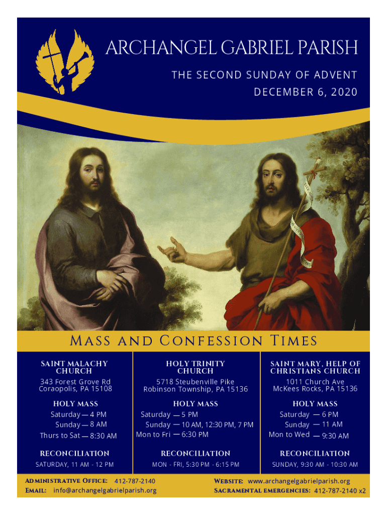 ARCHANGEL GABRIEL PARISH THE SECOND SUNDAY OF ADVENT DECEMBER 6, 2020Mass and Confession Times SAINT MALACHI CHURCH 343 Forest Grove Rd Acropolis, PA 15108 HOLY MASS Saturday 4 PM Sunday 8 AM Thurs
