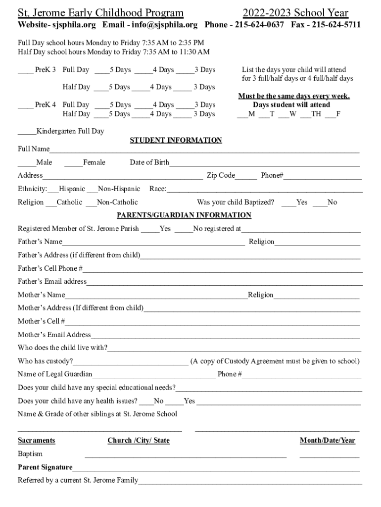 St. Jerome Early Childhood Program20222023 School YearWebsite Sophia.org Email info@sjsphila.org Phone 2156240637 Fax 2156245711